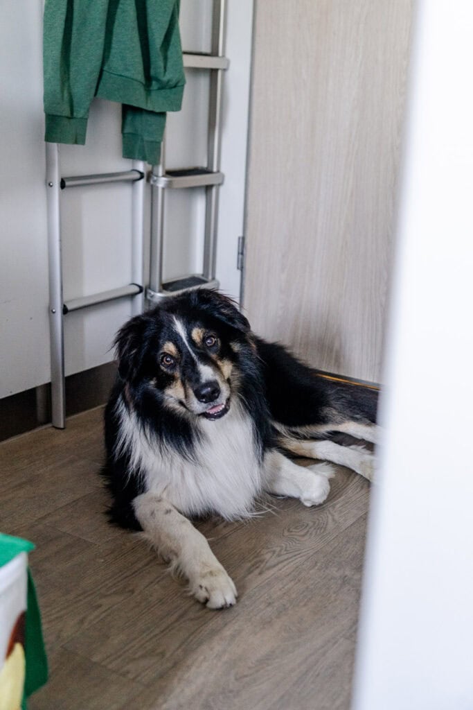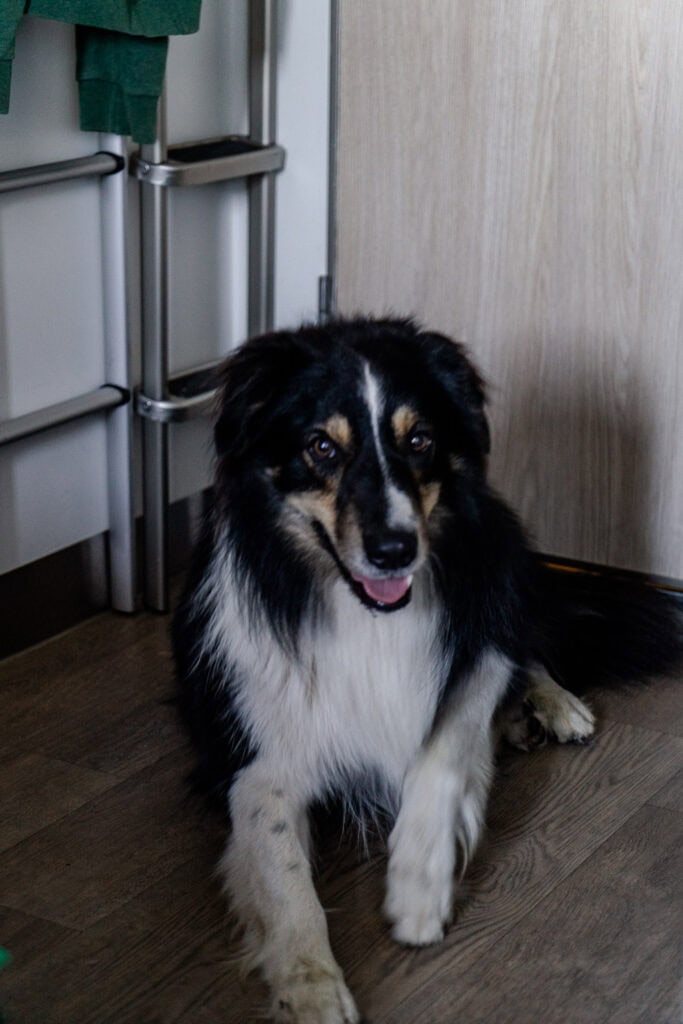 Er zijn geen eet- of drinkbakken in je hut. Zorg dus dat je deze zelf meeneemt. Ik had deze opvouwbare bakken bij me en die waren echt ideaal. Verder is een zacht speeltje zoals een knuffeltje handig en iets waar de hond op kan liggen. Een muilkorf voor als je van de auto naar de hut loopt en andersom wordt aangeraden, maar is niet verplicht. Ik heb geen enkele hond met muilkorf op gezien aan boord.