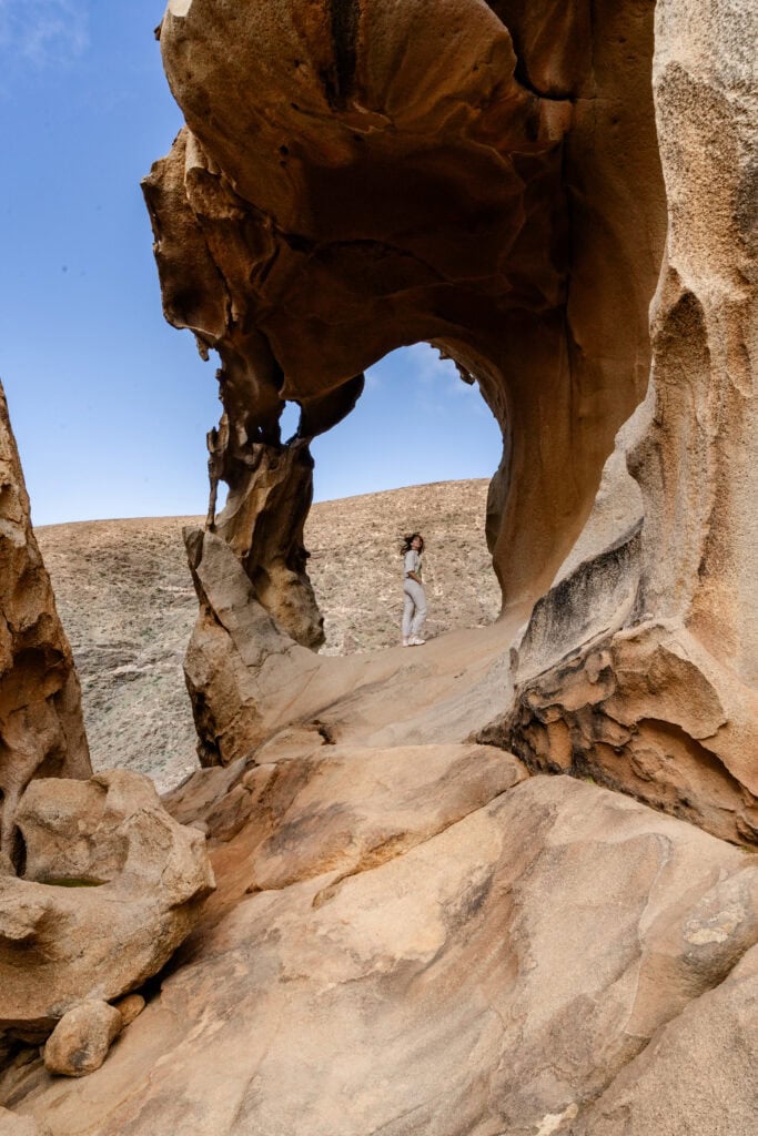 Misschien wel mijn favoriete plek op Fuerteventura is Vega de Río Palmas, een soort groene oase in het binnenland. Vega de Río Palmas is een klein dorpje vanaf waar je verschillende mooie hikes kunt maken. Ook de Camino Natura de Fuerteventura, een lange afstandshike van 151 kilometer van noord naar zuid, loopt hier doorheen. De mooiste wandeling vanuit hier is wat mij betreft de Barranco y Arco de las Peñitas hike. Het eerste deel van de hike voert je over een gemakkelijk pad door een soort palmbomenbos, waarna je uitkomt bij een aangelegde dam. Je loopt een stuk langs het water en komt dan bij een schilderachtig kapelletje. Dit stuk is heel gemakkelijk te doen. Wil je ook nog naar de Arco de las Peñitas, een natuurlijke stenen boog, dan moet je nog wel een stukje klimmen. Al met al een prachtige hike die echt een andere kant van Fuerteventura laat zien.